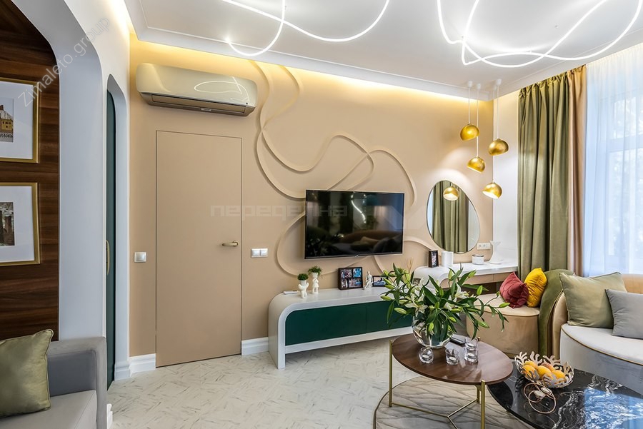 Комфортную атмосферу и свежесть воздуха в гостиной обеспечила сплит-система HISENSE Premium CHAMPAGNE SUPER DC Inverter - кондиционер с многоуровневой системой обработки воздуха, который после плазменной очистки проходит еще через три фильтра. Умный и красивый прибор с легким блеском разместился над входом в комнату, отменно вписавшись в композицию золотистых элементов интерьера.
